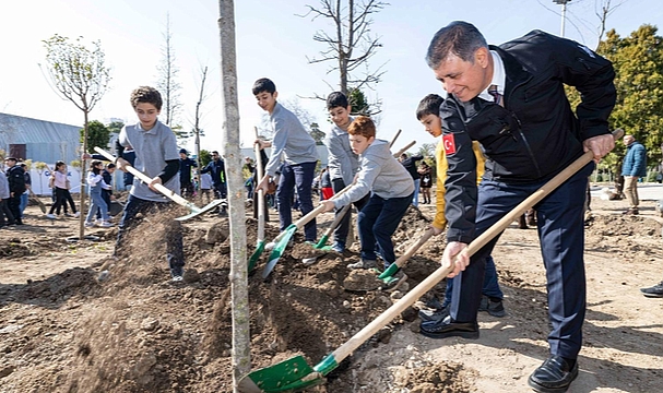 Başkan Tugay, konuşmanın ardından miniklerle beraber ağaçları toprakla buluşturarak can suyunu verdi. Ağaçlandırma çalışması kapsamında alana Doğu çınarı, akçaağaç, tarçın, sığla, ıhlamur, çitlembik, kurtbağrı, tijli defne ve erguvan türleri dikildi.