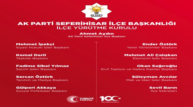 Yürütme Kurulunun yalnızca 10 kişilik isimler üzerinden değil tüm yönetimin desteğiyle güçleneceğini ifade eden Başkan Aydın yürütme kurulundaki isimleri kamuoyu ile paylaştı; “Yürütme kurulu tüm teşkilatlarımızla işleyecek bir saat mekanizması gibi olacak. Açıklanan birim başkanlarımız ilerleyen günlerde komisyonlarını kurarak yürütme kurulunu daha da güçlü hale getireceklerdir. Siyasetin işleyişinde asil üye, yedek üye, yönetim kurulu üyesi, yürütme kurulu üyesi gibi kavramlar vardır. Ancak biz AK Parti teşkilatı olarak böyle bir ayrımı yapmadık. Bugüne kadar sahada kurucu yönetimlerimiz, yeni dönem, önceki dönem, ana kademe, kadın ve gençlik kollarımızla tek vücut olarak çalışmalarımızı sürdürdük. Bu kapsamda yürütme kurulumuzdaki isimler; Siyasi Hukuki İşler Başkanımız Mehmet İpekçi, Teşkilat Başkanımız Kemal Derli, Seçim İşleri Başkanımız Fadime Sibel Yılmaz, Tanıtım ve Medya Başkanımız Sercan Öztürk, Sosyal Politikalar Başkanımız Gülperi Akkaya, Yerel Yönetimler Başkanımız Ender Öztürk, Ekonomi İşleri Başkanımız Mehmet Ali Çalışkan, Sivil Toplum ve Halkla İlişkiler Başkanımız Okan Sağıroğlu, Mali ve İdari İşler Başkanımız Süleyman Avcılar, İlçe Sekreterimiz ise Sevil Barın olmuştur. İlçe Yürütme Kurulu Üyelerimize yeni dönemdeki çalışmalarında başarılar diliyorum. Görevlerini devreden Başkanlarımıza emekleri için çok teşekkür ediyorum. Seferihisar’da güçlü kadromuzla vatandaşlarımızın hizmetkarı olmaya hazırız. Teşkilatlarımıza ve Seferihisar'ımıza hayırlı olsun” ifadelerini kullandı.